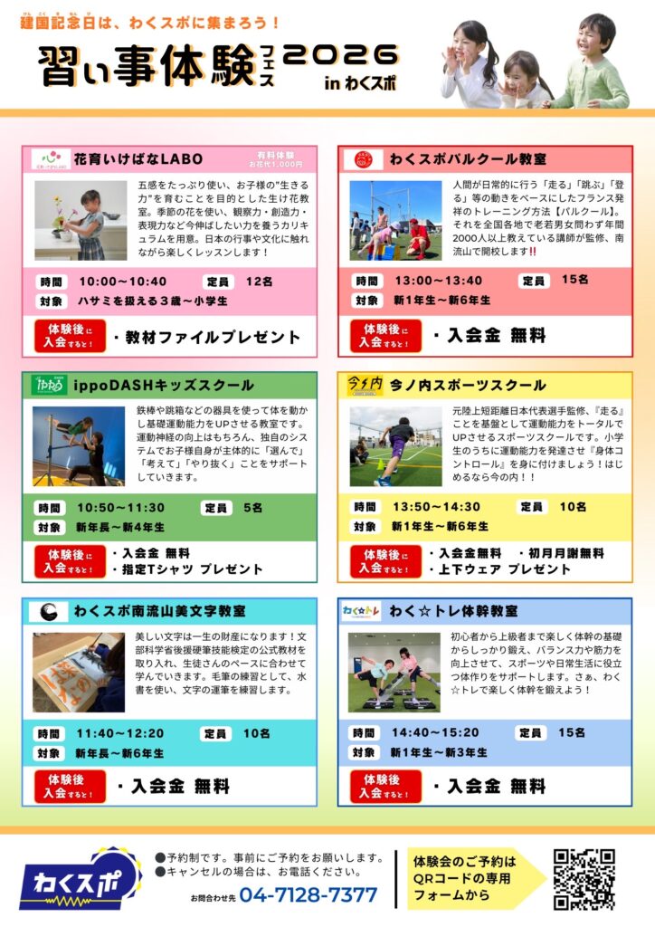 わくスポ南流山美文字教室 習い事体験フェス2026 2026 2/02 お知らせ 2026年2月2日 習い事体験フェス2026 開催日 2026年2月11日 時間 11:40~12:20 定員 10名 対象 新年長~新6年生 ※体験後入会すると入会金無料 お知らせ よかったらシェアしてね! URLをコピーしました! URLをコピーしました! 2025年12月26日(金)書道 × お正月飾り コラボレッスン 初石教室 リニューアル工事に伴うお知らせ